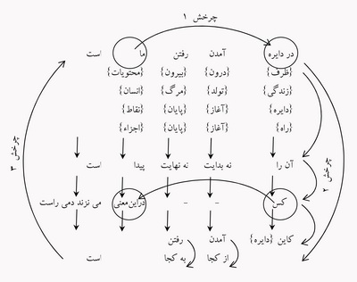 نکتهای که انتقال ویژگیهای “زندگی” یا “طبیعیت” بر “انسان” را تقویت میکند، با جابه جایی معنادار دو عنصر واژگانی “کس” و “در این معنی” در سطر سوم قابل مشاهده است که “در این معنی”، به “آمدن/رفتن”، “بدایت/نهایت”،... اشاره دارد، اما در ساختار نحوی در زیر مقولهی “ما/انسان” قرار میگیرد و “کس” که باید زیر مقولهی “ما/انسان” قرار بگیرد، در زیر مقولهی “در این معنی/...” قرار میگیرد؛ درنتیجه، در یک رابطهی علی - معلولی دایره و انسان یکی انگاشته میشوند.