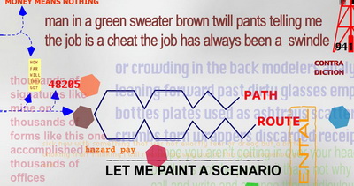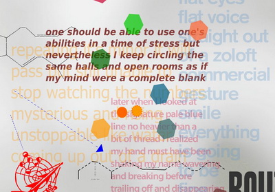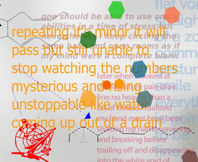 در همین قطعه، اگر کاربر به جای حرکت موشواره روی لایهی دوم، یکی از شش ضعلیها را فشار داده بود، با متنی دیگر و درنتیجه تفسیری دیگر مواجه میشد. به عنوان مثال، به جای لایهی دوم، اگر مخاطب بر شش ضعلی دیگری کلیک کرده بود، با متنی دیگر رو به رو میشد. من به عنوان یکی از مخاطبان احتمالی، بر شش ضعلی زرد کلیک کردم و این متن به عنوان مکمل متن قبلی که خوانده بودم، حاضر شد: